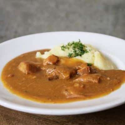 Beautifully tender pork shoulder meat stewed with onion makes this the perfect simple warming-up dish. DonÕt dig around in it looking for the vegetables; this is the Polish version! Served nestled beside a mound of our freshly mashed potato.